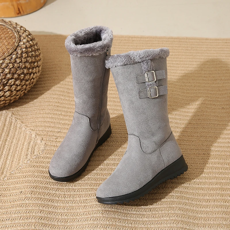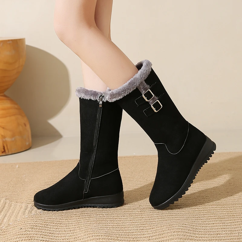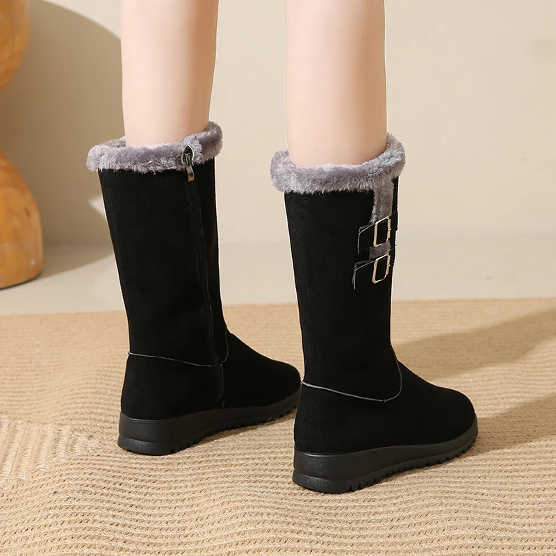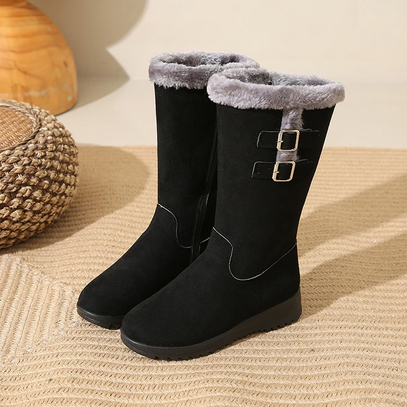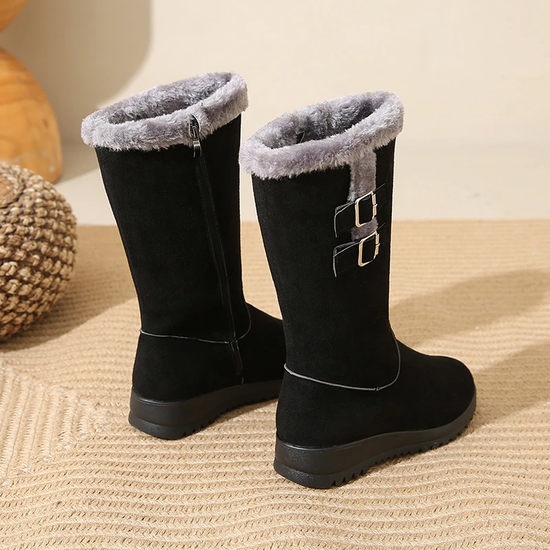 Desfrute de calor e conforto em dias frios com o forro felpudo que mantém os pés quentes sem sobrecarregar o peso. A sola espessa oferece tração estável em calçadas geladas, enquanto o cano alto protege contra o vento frio e completa o visual de inverno. O ajuste com fivela facilita colocar e retirar as botas, oferecendo conforto durante todo o dia, seja no trabalho ou no lazer. O design em bico arredondado e o estilo Office Lady tornam estas botas versáteis, perfeitas para combinar com jeans, saias ou vestidos, mantendo uma aparência elegante e prática. Embora não sejam impermeáveis, são ideais para uso diário em condições frias, com cuidado adequado em dias de chuva ou neve úmida.