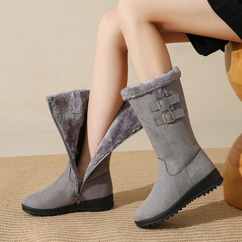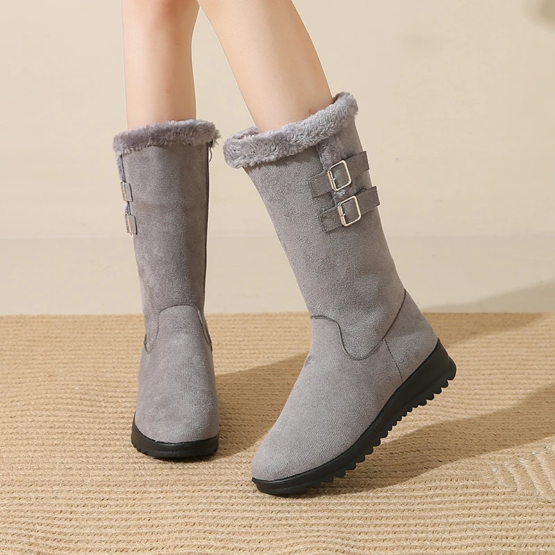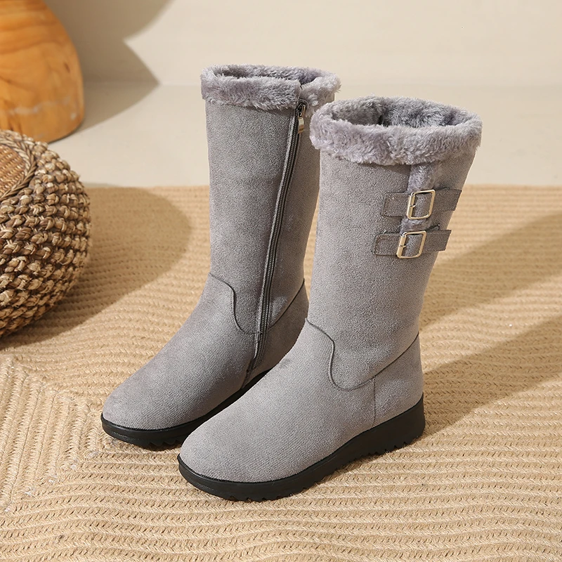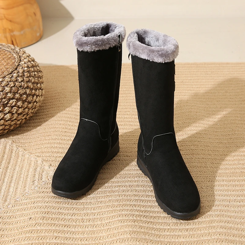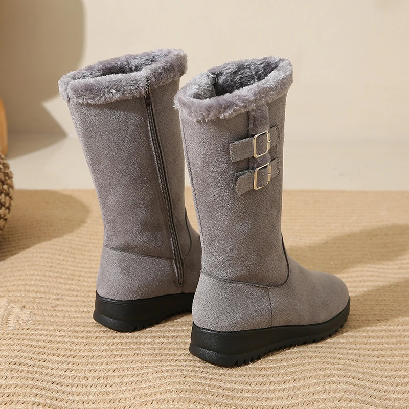 Desfrute de calor e conforto em dias frios com o forro felpudo que mantém os pés quentes sem sobrecarregar o peso. A sola espessa oferece tração estável em calçadas geladas, enquanto o cano alto protege contra o vento frio e completa o visual de inverno. O ajuste com fivela facilita colocar e retirar as botas, oferecendo conforto durante todo o dia, seja no trabalho ou no lazer. O design em bico arredondado e o estilo Office Lady tornam estas botas versáteis, perfeitas para combinar com jeans, saias ou vestidos, mantendo uma aparência elegante e prática. Embora não sejam impermeáveis, são ideais para uso diário em condições frias, com cuidado adequado em dias de chuva ou neve úmida.