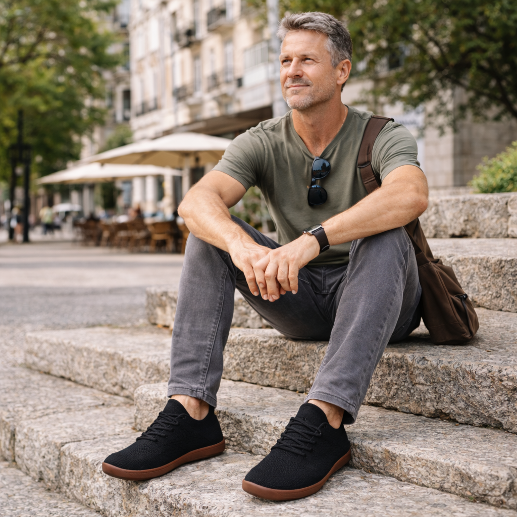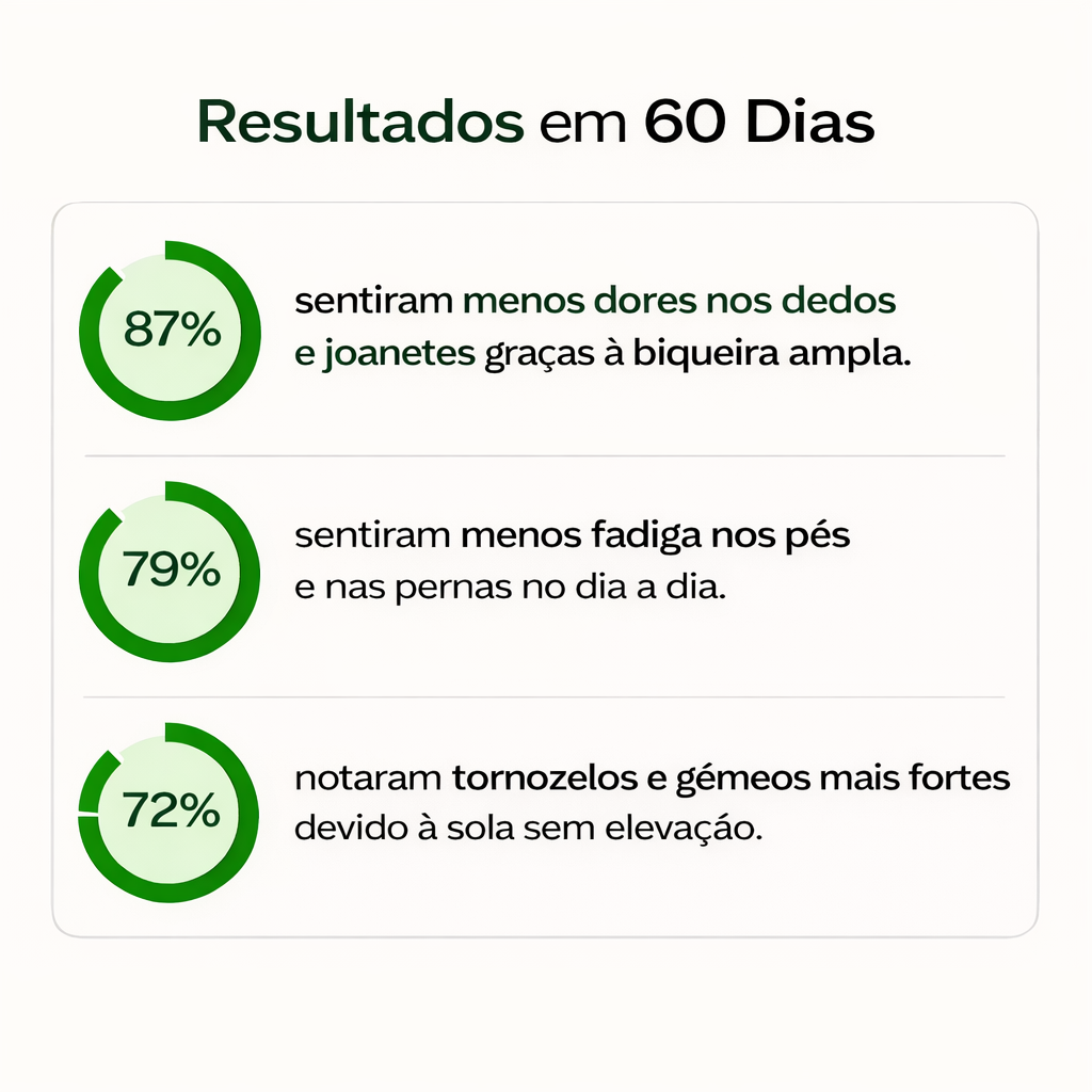 Em 60 dias, a diferença sente-se: menos dores nos pés e nos dedos, menos fadiga ao longo do dia e maior estabilidade ao caminhar. A sola sem elevação ajuda a melhorar a postura e a fortalecer pés, tornozelos e pernas de forma natural. Conforto real, com resultados que se notam.